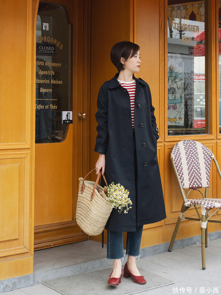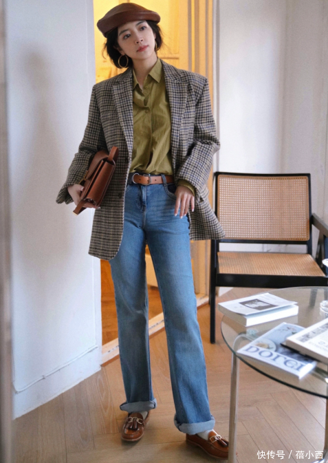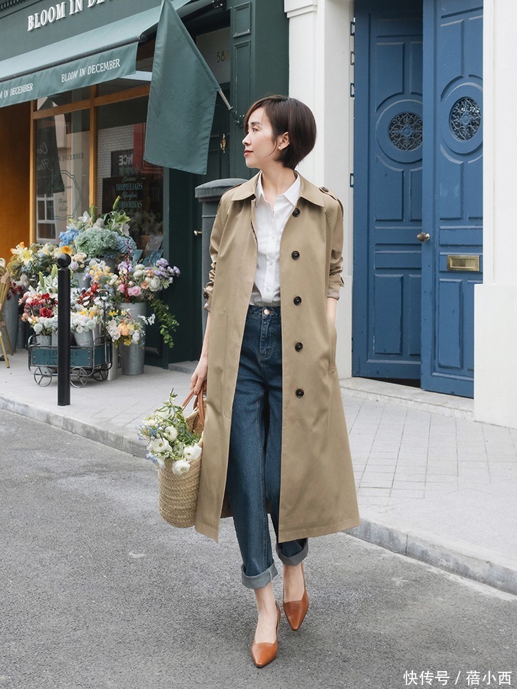 在穿牛仔裤和风衣或者是大衣的时分,提议大家打开,像大衣搭配牛仔裤,打开穿不错表现咱们的腰线。